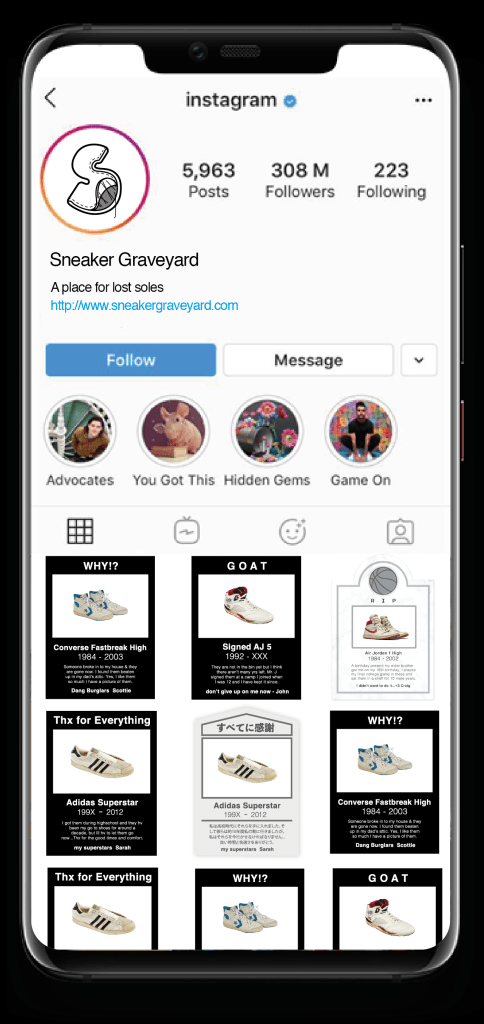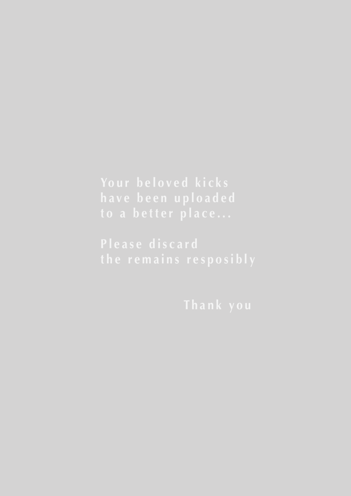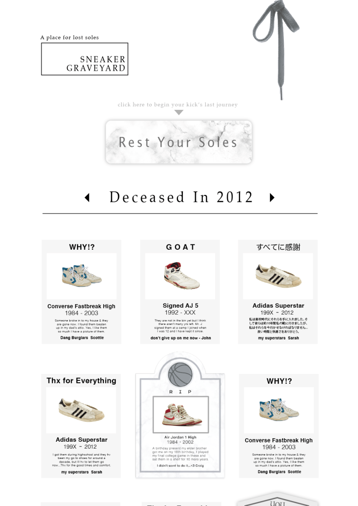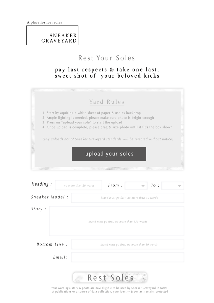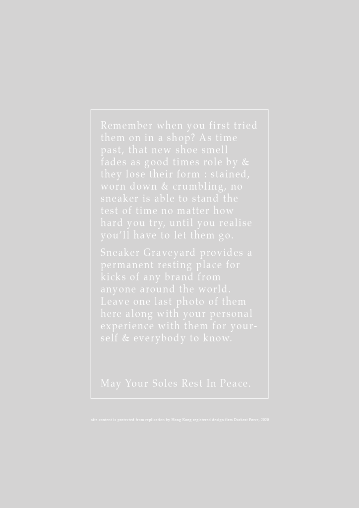 So knowing im not alone and the fact that no sneakers last forever even if you don’t wear them…Sneaker Graveyard plays on the emotional attachment with sneakers and wants to help people let go of their “dead soles” by hosting a permanent platform where sneaker heads could honour their sneakers and properly let go by leaving a headstone with the sneaker’s photograph and a short reflective story to go along with.