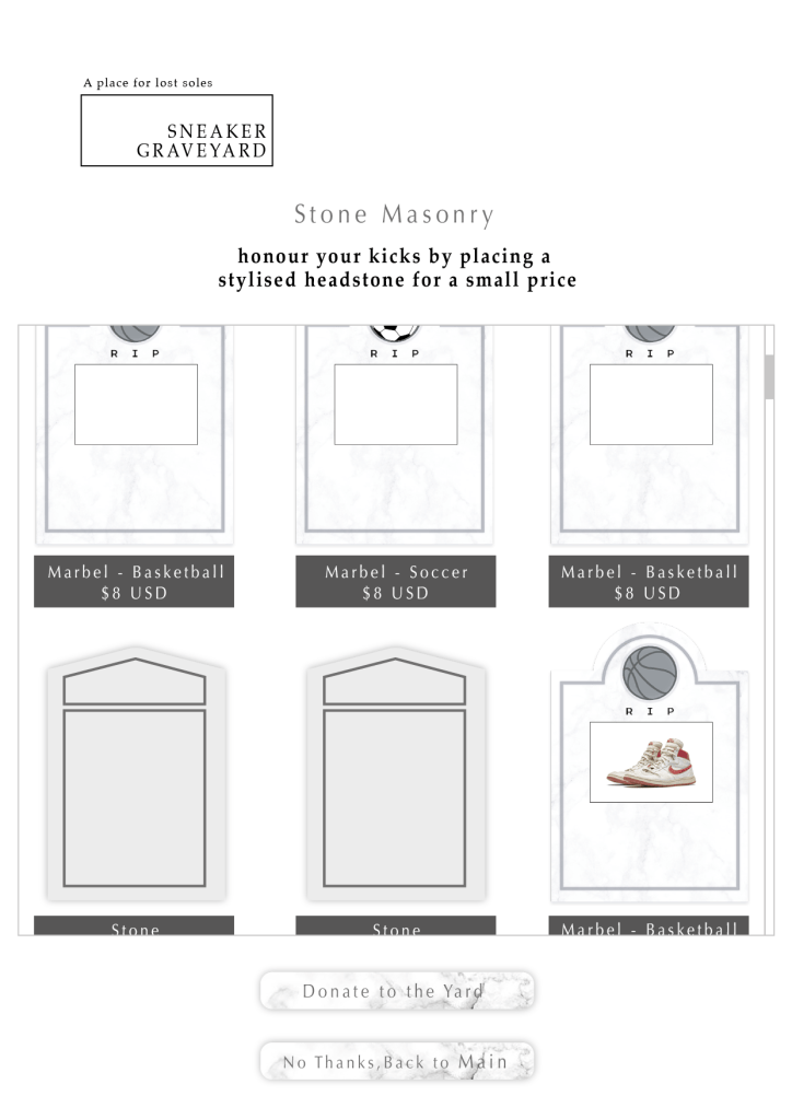 Wanting it to look like an actual graveyard I leaned more towards white and greys with marbel texture, but is still considering if the street element should be played upon more. Since most websites now have drop menus and all kinds of functions and like 20 buttons, I want this to be different and user friendly: I designed this to be 1 flow, the usual “about us” is being shown the first thing when visiting, then the post wall is all there for people to enjoy with 1 big button for you to enter the submission flow, the submission is a simple form fill in and right afterwards you are shown the shop were you could have a better “headstone” for a few bucks.