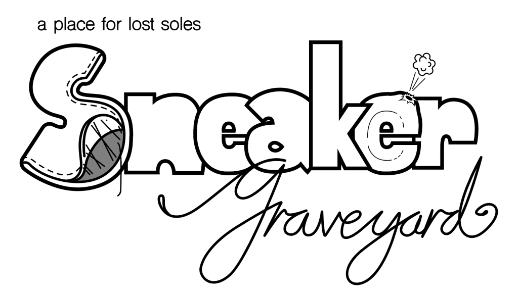 I started sketching quickly came up with a chubby font paired with a slender cursive “Graveyard” I found fitting, but then was trying to look for more elements to communicate “worn sneakers”, then I started to picture all the heartbreaking things which could happen to a sneaker: separation of leather and sole, hole in air pockets, dirt and grime etc.