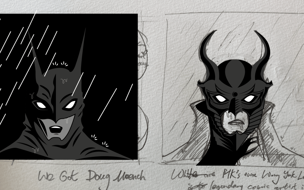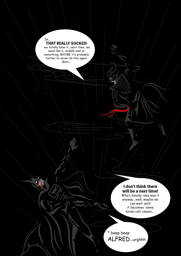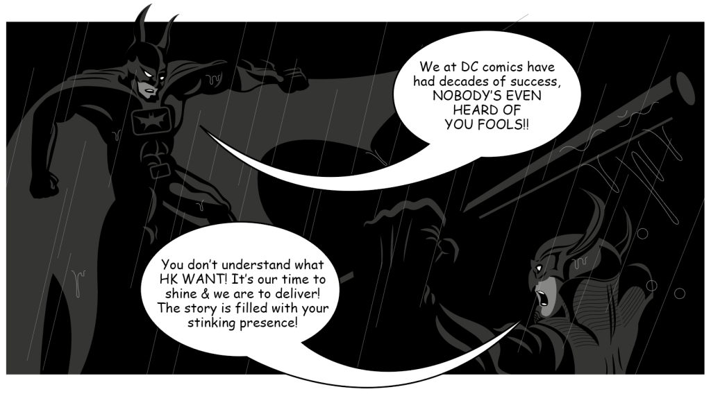 As we were supposed to work on a piece of editorial design to talk about our findings, I told myself I wanted to find the time to work on a comic strip with Batman and Night Dragon slaughting it out with the above writing to be fit in as dialogue.