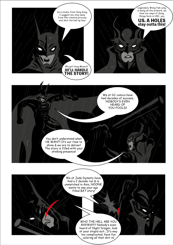 Both DC and Jade Emperor claiming to have sent their biggest of guns, GRAND daddy’s of their established companies to do the job, both were later found to have hired someone else to step in while they kept the bigger names of Doug Moench as writer & Wong Yuk Long as artist. The evident struggle which this collaboration have suffered is that there was a tone of dialogue, having pieced together short posts, comments of the very very little documentation online reguarding this publication, the common impression is that the folks over at DC were introduced this project of creating a story and have it sent over to Jade Dynasty in HK to work on the art, and evidently the writing was long, draggy and dominated the whole book, readers having claimed that the story having gone nowhere near interesting, rumours of a then assistant Khoo Fuk Lung was wearing a sad face the whole time he was inking this piece.