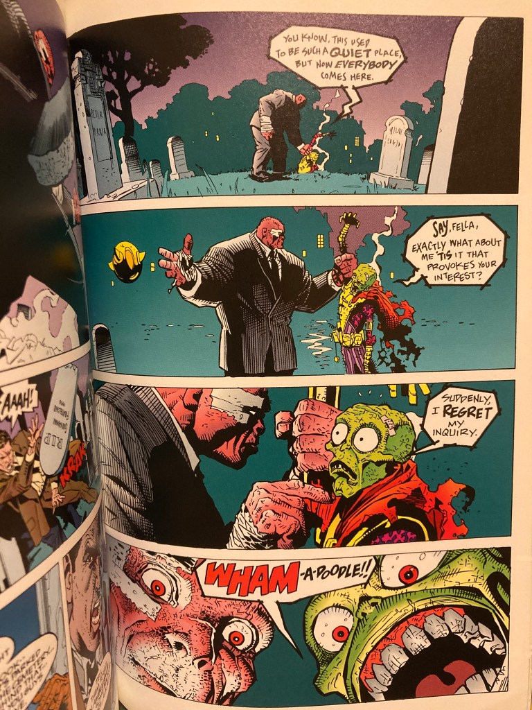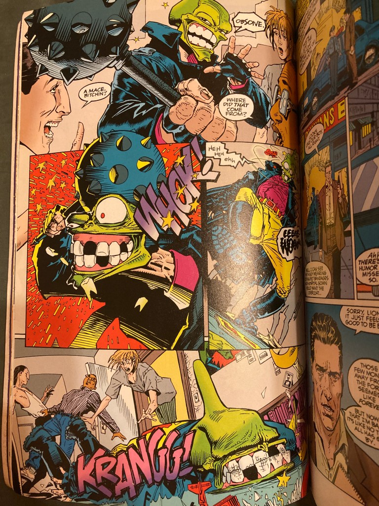 The Mask Strikes Back by Titan Books is such a GREAT comic, I own bigger well-known titles like Maximum Carnage (Marvel), Zero Hour (DC), Deadpool : Killustrated (Marvel) etc., but nothing beats the framing, inking and writing of The Mask Strikes Back. Just on the 2 pages above there’s : worms eye view, extreme close-ups, two shots and crowd shots AND comic techniques like flow of read and continuity. The success of utilizing all these techniques has allowed this story to jump from realistic to cartoon, dramatizing all that is happening in a fun to read, engaging piece of pop-art!