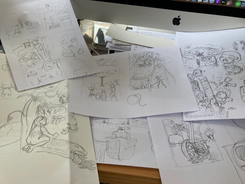 It took a while to have that touch with the pencil kick back in, page after page of attempts were done and finally some of these figures start to make my standard. I then came to a realization: Countless comic artists sit at their desk on Youtube videos and on their drawing board is this ever polished drawing, the footage of that made the cut, but behind the camera how many attempts have they made? Even master artists like Alex Ross and Todd Mcfarlane might have quite a pile of sketches and layouts that end up in the trash…so who am I to not go nuts and just make attempt after attempt? That’s exactly what I did.