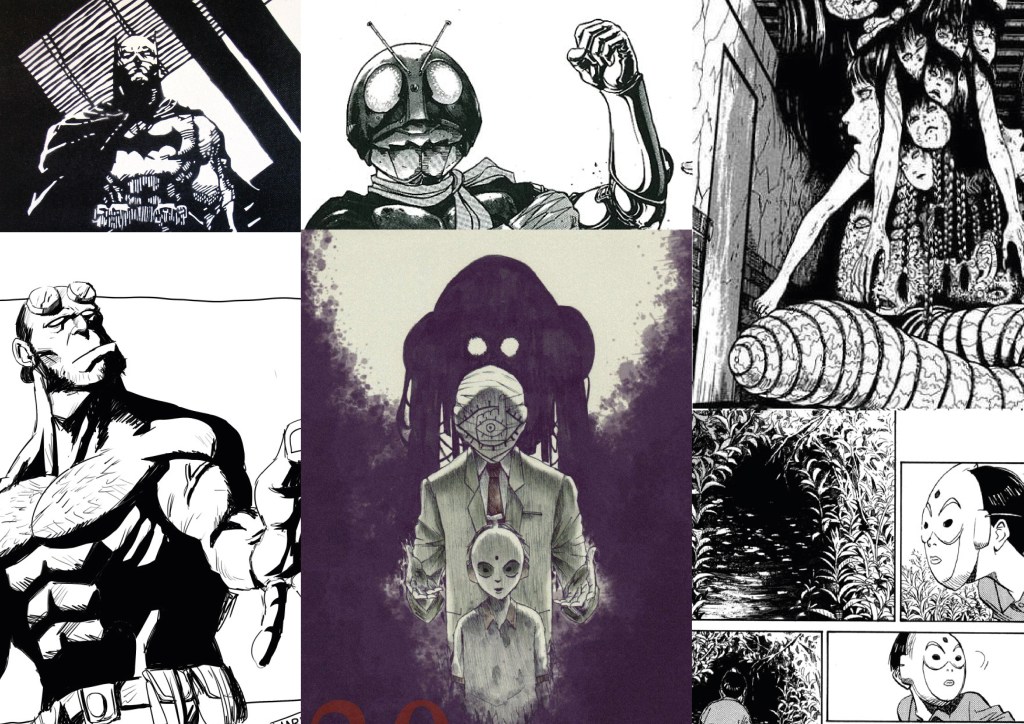 I want the comic to appear dark, giving the reader a sense of unease as one scans the panels. I selected panels from Kamen Rider (Shotaro Ishinomori), Hellboy (Mike Mignola), 20th Century Boys (Naoki Urasawa) and from Japan Horror Master : Junji Ito. They are all known for a solid high contrast, shadow and texture heavy drawings which is exactly what I am after, which I think is great for blood and gore yet pops and stands out in a modern way compared to the inside panels of more traditional artists like : Jack Kirby, Todd Mcfarlane and Alan Moore, which they take more advantage of color print.