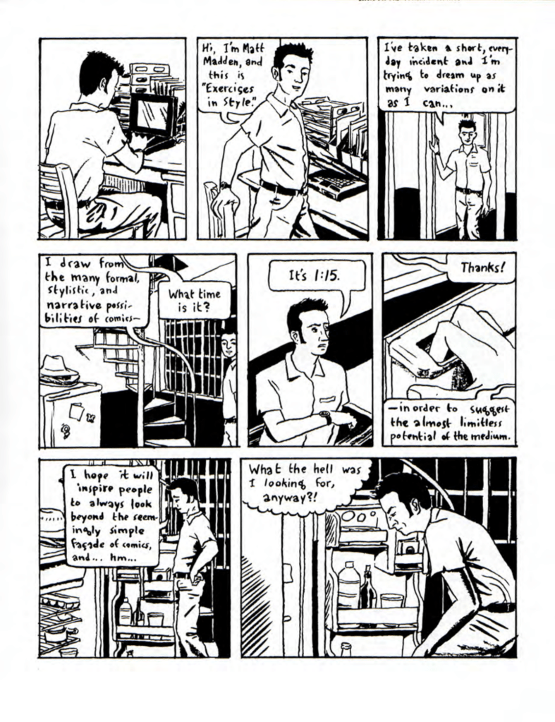 As my drawing started to look a bit better from just drawing around 2 hours a day, Richard provided me with some splendid advice in looking into comic panels vs film camera angles and techniques + to have a look at Matt Madden’s 99 ways to tell a story.