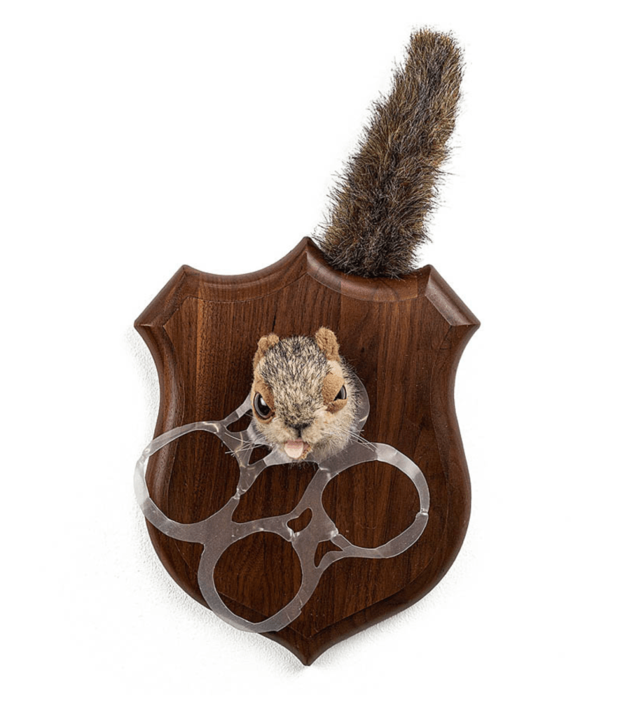 As I mentioned above, there are no touch-screens attached to this “piece”, but he once again made his protest out loud with stuffed animal heads, an old helmet, wood, couple orders from local factories (UK made products was emphasised), in it I am able to identify: